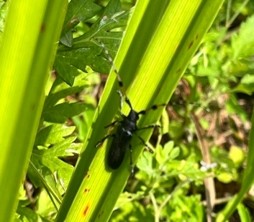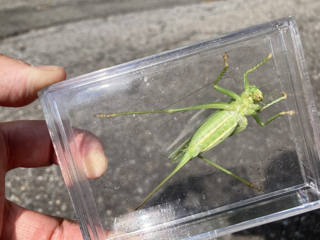 中本先生の主なフィールドである蒜山高原のウサギ調査(センサーカメラの交換、糞採集など)を全メンバーで体験しました。また、希少な蒜山固有種であるフサヒゲルリカミキリの野生個体も観察することができました。