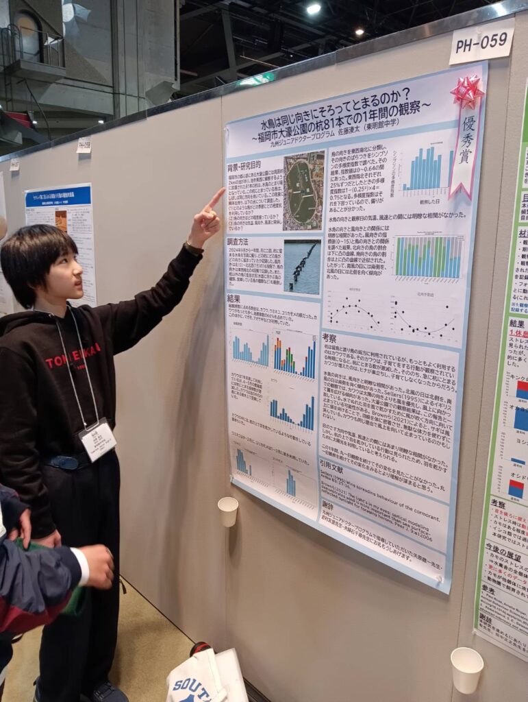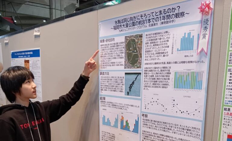 テーマは「水鳥は同じ向きに揃ってとまるのか?福岡市大濠公園の杭81本での一年間の観察」で、研究の成果を堂々と発表しました。